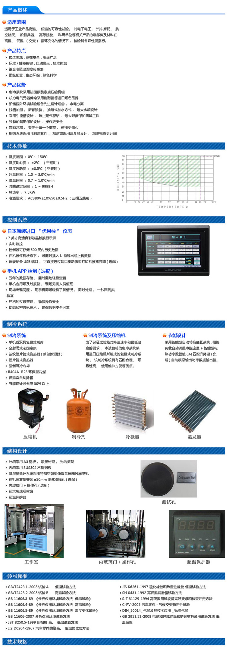 本類試驗箱符合國家標準GB10589《低溫試驗箱技術條件》和GB11158《高溫試驗箱技術條件》,帶濕度試驗箱還滿足GB10586《濕熱試驗箱技術條件》。具體設備參數以技術協議為準。